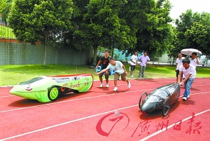 历经暑假两个多月打造,外形如一颗黑色子弹、25毫升汽油可跑8000米的概念车“子弹头”惊艳亮相,近日在华农大操场进行了性能测试。这辆车的制作团队主要由30多名大三大四学生组成,从制作配件到设计安装全部手工完成。该车全长3.2米,高70厘米,重约20公斤,由一人驾驶,时速可达40~50公里,本月下旬将赴上海参加一项节能车竞技大赛。