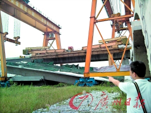 “吊塔把预制梁吊起,准备安装在桥上时,右边的吊臂突然与预制梁脱节了,这块600多吨的预制梁就从空中砸下来,把放在下面的另一块预制梁也压坏了。幸好当时底下没有人,否则会出人命。”据一名当时正在上夜班的工人介绍,当时工地负责人马上停止了施工。