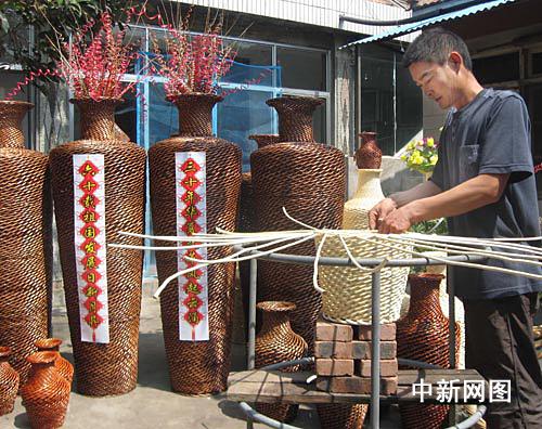 中新网临沂9月10日电(记者 周秀光 通讯员 周宝云)“三十年华夏改革风起云涌,六十载祖国发展日新月异”。走进山东省郯城县庙山镇薛庄三村村民吕士明家的庭院,四个硕大的柳编“宝瓶”一字排开,将小小庭院挤得满满当当。指着宝瓶上的对联,“宝瓶”编织者吕士明充满自豪的说,新中国成立六十周年,俺也得献上一份贺礼。