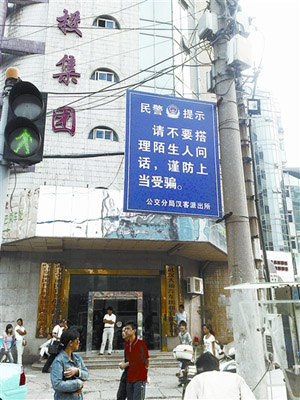 “我是东北人,在汉口火车站下车想问个路,结果别人都指着一个大大的蓝色提示牌不理我,牌上写:‘请不要搭理陌生人问话,谨防上当受骗。’这牌子让外地人看了很不舒服。”昨日,汉口火车站旁的一块提示牌引起了外地游客的异议。