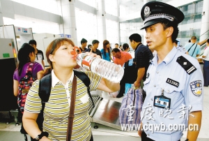 昨日下午2时许,(重庆市)龙头寺候车厅检票处,凡是拿着矿泉水瓶进站的乘客,都要先喝一口,然后才能顺利进站。据悉,这是重庆铁路公安处新出台的安检规定:凡液状体物品进站,一律开瓶检查,而自带饮料的,则必须亲自喝一口。