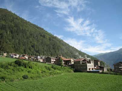 这就是“白菜公主”居住的砍竹村上寨,蓝天、森林、草场、白菜地、石砌藏房,真是世外桃园。该村距317国道仅两公里,有路况较好的通村公路连接国道,是自驾游理想的目的地。
