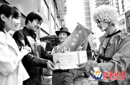 太原市民刘先生作为小丑快递公司的第一位服务对象,就亲身体验了一把小丑带来的惊喜和快乐。前几天他过生日,中午时分准备下班时,“一出门看到3个动作滑稽、模样可爱的小丑,其中一个捧着一盒生日蛋糕。”当得知蛋糕是爱人卢女士委托小丑快递公司送来的时候,刘先生特别高兴,“同事们都过来围观,3个小丑还唱起了生日歌,演起了节目,感觉很幸福!”