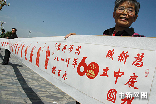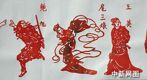 中新网周口9月22日电 (记者 关涛 吴娜 通讯员 杨正华)9月21日,在河南省淮阳县羲皇文化广场,人们在欣赏《水浒传》108将人物剪纸作品。为了向新中国成立60周年献礼,河南省淮阳县68岁的退休教师何淑英耗时近四个月,创作了一组剪纸长卷《水浒传》人物一百单八将。该长卷作品长25米,宽0.47米,共塑造了《水浒传》中梁山好汉108将,作品活灵活现,栩栩如生,表达了她喜迎祖国60华诞的喜悦心情。