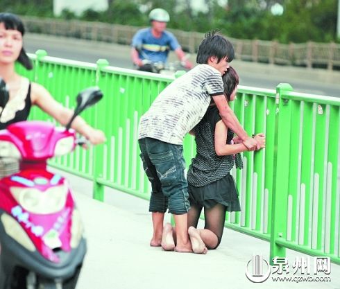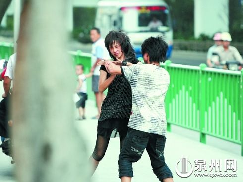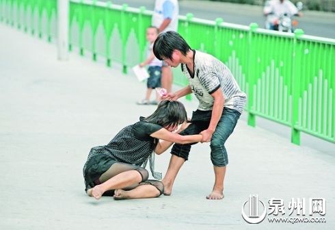 昨日下午4时15分许,泉州市区坪山路与宝洲街交界处的鑫亿大厦楼下,一对双双赤脚的青年男女拉拉扯扯大声争吵,引来路人围观。