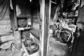 两口子经过“设计”,把五姐妹安排在“大”炕上。夫妇两人利用厨房灶台边仅有的空地,用几把破椅子搭成个一米多宽的“小床”,他们每天就佝偻着睡在那。