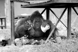 一段时间以来,云南野生动物园里的红毛猩猩培培由于贪恋美食,学会了朝游客勾手指要零食,这令它越来越胖。饲养员想了许多办法试图帮培培戒掉要零食的习惯,然而都不奏效。9月9日开始,野生动物园向社会寻求帮助培培戒零食的方法。昨天(21日)上午,野生动物园选择了其中一些,给培培尝试了一下。不过,结果证明培培根本不吃这一套。