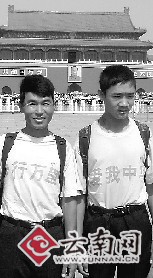 用了近半年时间,行程达万余里,从云南临沧市云县徒步启程,途经广西、湖南等7省(区),最终赶在新中国60岁生日前顺利到达首都北京。从今年3月开始,云县的杨世和及儿子杨泽泳,带着家乡人对祖国的祝福,以“徒步”的独特方式喜迎新中国成立60周年。