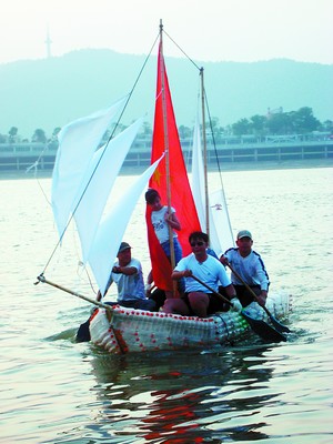 “这次航行主要是宣传环保,为祖国六十周年献礼。”“夏天”激动地说,他们打算将这艘特殊的船拍卖,并把所得捐献给希望工程。据悉,除同行的一名小女孩外,其他船员都会游泳,一路划来,他们每人吃了4个月饼,但喝光了一箱矿泉水。 (记者 陈勇)