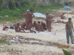 昨日中午,记者来到三亚大东海旅游区,顺着南中国酒店一直往里走,在大东海旅游区的沙滩上,几名男子全身裸露赫然立在海边,场面甚是不堪入目。而在旁边的沙滩上,更有三四十名男子也全身赤裸,或坐或躺在沙滩上,有的悠闲地看着书,有的则三五成群聚在一起打扑克牌。每有游人路过,都向他们投去异样的目光,而记者注意到,这些裸晒男子则毫不在意行人的眼光,依旧怡然自得地享受着日光浴。