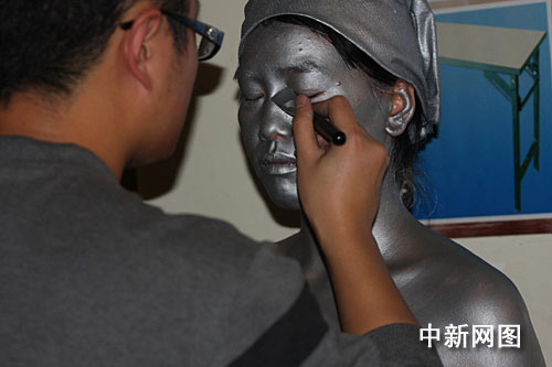 在雕塑现场,工作人员用类似于油漆的东西涂到模特的肌肤上或衣服上,甚至涂上嘴唇和眼睑。整体涂刷一遍后,晾干几分钟,对涂刷的不足的地方再补一次即可。然后,晾干,模特摆个造型,就可以以“真”乱“真”了。当场还真能唬住不知情者,他们在观看雕塑时“雕塑”眨眼吓一跳。完