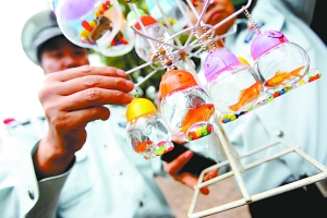 昨天,(北京)丰台城管队员在过街天桥上查扣“密封鱼”钥匙扣。这种活鱼钥匙扣既不透气又无法喂食,鱼在封闭的空间里不久会死掉。