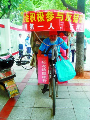 2001年11月,江苏省徐州市铜山县农民陈冠明开始骑着三轮车环游中国宣传环保。时至今日,8年间陈冠明骑着三轮车走遍全国1600余个城市,行程7万多公里。一边拾垃圾,一边做宣传,一路走来,陈冠明拾起的垃圾已装了4000余袋,约7吨重。昨日上午10时许,“三轮滚滚健康行,绿色环保讲文明”,陈冠明骑着三轮车行进在长沙五一大道上。