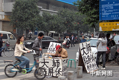 中新网郑州10月13日电(记者 李朝栋)国庆刚过,就赶上全国秋季糖酒会举行,这几天的郑州大街小巷可谓像过节一样热闹。然而,记者在闹市中发现一怪现象,不知什么时候郑州街头突然冒出了许多贴屏保的“大师”来,那“大师”招牌之大、之显眼,大有“你不想看到都不行”之意。
