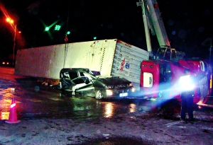 据有关部门介绍,昨日凌晨2时15分许,司机袁龙驾驶一辆内蒙古牌照的集装箱式大货车,由密云县前往辽宁省沈阳市运送货物。途中,该车经通顺路,由北向南行驶至顺义区通顺路米各庄路口时,与一辆西向东驶来的现代商务轿车相撞。其间,货车司机袁龙向左打轮躲闪过程中向右发生侧翻,将商务轿车压在右侧货箱之下,造成轿车内人员全部被困。