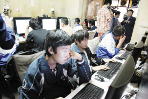 中午11点半左右,网吧涌进十几个穿着八十九中校服的学生,孩子们很熟悉地朝胖女子打着招呼,喊了声“姑姑,开机”,胖女子便忙活着收过钱后,一一为孩子们开机。由于机器有限,没争到电脑的学生只能站在后面一边看,一边搭话聊天,不舍得离开。记者看到,为了赶时间,很多孩子都着带盒饭,边吃边玩。有些没有带盒饭的孩子,一边紧张地打着游戏,一边叫胖女子泡一碗方便面,匆匆吃几口,又开始进入游戏中。下午4点20分左右,身穿校服的孩子们再次大量涌入,为了不被家长发现,有些孩子甚至将自行车搬进了网吧。