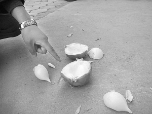 当记者赶到现场时,杨先生已被120急救车拉往医院检查治疗。在这栋居民楼下,一个被砸成四分五裂的洋葱,仍留在地面上,据目测,这个洋葱的直径至少在10厘米以上,重量也差不多有500克。
