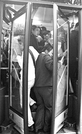刚上车的一名女乘客手里拿着一盒牛奶,由于前面的一中年男子被挤得重心不稳,突然往后猛退,女乘客手里的牛奶被挤爆。鹅公岩南桥头有人下车,站在门边的记者只能下车让路。哪知十余人越过记者一拥而上往车上挤。直到车门关闭,记者也没能再次挤上车。