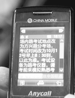 10月12日,汪先生把这条短信转发给记者时,仍然愤愤不平。他说,他是9月30日收到这一短信的,由于他在单位岗位特殊,假日期间需要值班,请假非常不易。收到这一短信后,几经同领导协商,才在10月7日那天请了半天假参加模拟考试。那天,参加模拟考试的人非常多,在业务大厅,他像其他人一样花50元买了一张模拟训练卡,被告知有两次模拟测试机会。但从上午等到下午3时许,他才有了一次测试机会,这一次没通过,他只好再次排队,到再次轮到他时,已经快要下班了。