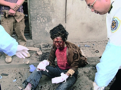 当天下午,记者闻讯后迅速赶往雁滩高滩村,只见事发地在马路边,周边全是各种建材加工厂和建材仓库。发生爆炸的废品回收站在一栋两层小炮楼下,地上到处是爆炸留下的碎玻璃碴。靠近小炮楼北端处,人们围成一团。记者挤进人群,只见一男一女躺在地上痛苦地呻吟着,两人脸上血肉模糊,身上地上到处是鲜血。急救人员对伤者做了紧急救护后,将两人送往医院。