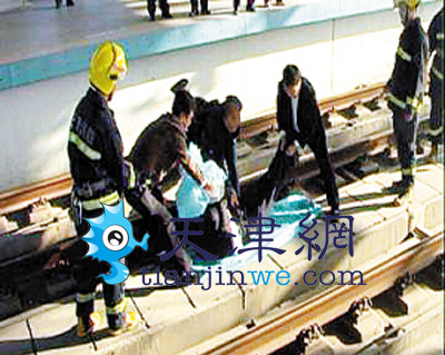 记者在出事的候车台看到,铁轨旁倒着一名身穿黑色西服,白色衬衣的男子,其肢体已经被碾轧得血肉模糊,铁轨上有一段两三米长的血迹。现场的120急救人员确认,男子已经当场死亡。随后,消防员将尸体弄上担架,抬出候车站台。