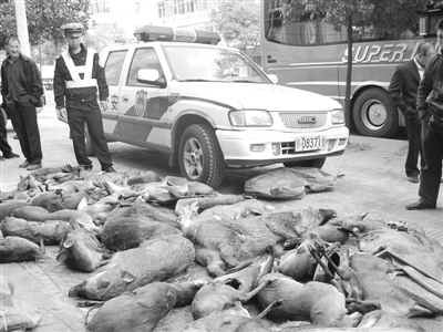 28日下午,省高管十三大队民警在汉十高速公路土关垭收费站值勤时,对一辆十堰开往昆明的云AR2***大型卧铺客车例行检查时发现客车下部行李舱内有六个满是血迹的大蛇皮袋子。经过仔细检查,民警被眼前的惨相惊呆了:蛇皮袋子里面全部装着野猪和黄麂(均属省级保护动物)的尸体。经过清点,共查出32只黄麂和4只野猪的尸体。