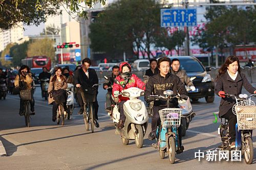 中新网郑州11月2日电 (记者 晏立海)自蒙古国南下的冷空气将自北向南影响,今天,郑州虽阳光普照,气温却是入秋以来最冷的一天,最低气温跌到了0℃,最高温度也只有为8℃,加之3到4级的偏北风“劲吹”,市民出行可谓“全副武装”,棉衣、帽子、手套、口罩全部上阵,甚至骑车一族再反穿一件棉衣用来抵御迎面而来的寒风。完