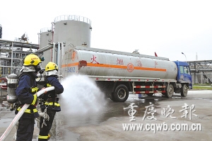 晏家特勤中队3台消防车最先赶到罐车后面。意外发生了——罐车司机一见消防车,竟加大油门,开着仍在泄漏的罐车快速驶向长寿化工园区。