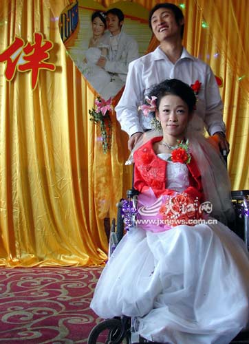 1日上午,九江市美丽的庐山脚下的教堂里,举行了一场特别的婚礼:28岁的新娘王志宏是一名脑瘫女孩,同龄的新郎姚琪则是一名千里迢迢从吉林追到九江、非王志宏不娶的帅气男孩。“不管今后的生活有多么艰难,我都会照顾你!”姚琪饱含深情地对妻子说。