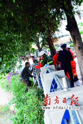昨天(4日)上午,广州体育学院一名学生抓到一名偷电脑的小偷,不料小偷在被押往警务室的途中,挣脱保安跳入沙河涌并躲进排污口两个多小时。据抓获小偷的保安介绍,小偷跳入河中后,路过的同学见了,纷纷拿东西砸向小偷,小偷叫嚣道:“再砸就把你们宿舍偷光!”