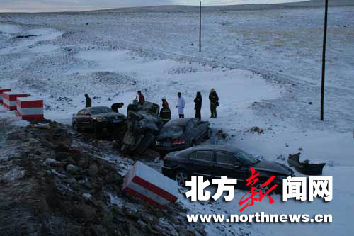 接到报案后,民警立即驱车赶赴现场。经了解,这个车队共有6辆车,是当天赶早从松山区大夫营子乡驶往翁牛特旗迎娶新娘的婚车。该路段属于急弯冰雪路面,第一辆车驶进弯路时,由于车速过快导致车辆失控,撞飞路边的隔离墩后,冲入右侧的路基下,随即,后面的4辆车尾随着冲了下去。幸好第六辆车与前车相距较远,及时制动,逃过此劫。
