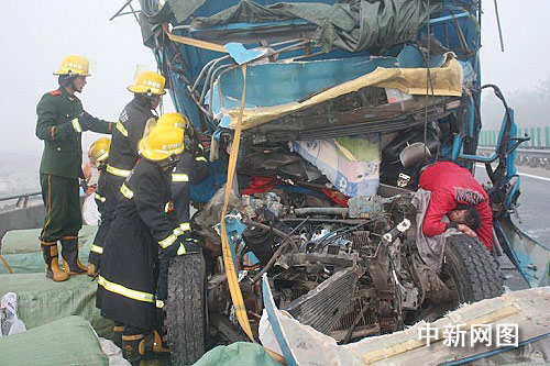 为了尽快抢救被困人员,消防员迅速对货车进行破拆,很快消防员就看到了驾驶员,但是现场急救医生确认该名司机已死亡。随后,消防队员又用两台液压扩张器分别对车后座进行破拆营救后座的驾驶员,可惜经检查该被困人员也已经死亡。
