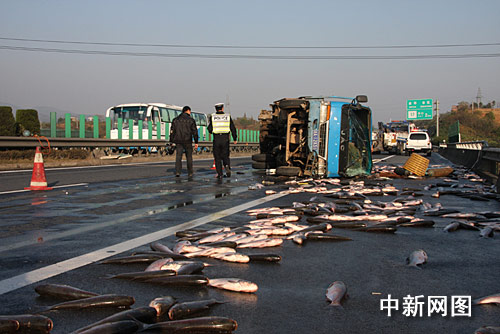 中新网金华11月26日电(记者 袁爽 通讯员 朱跃强)近日,一辆载有一吨左右白鲢的货车在杭金衢高速公路发生侧翻,车上的一吨多鱼儿倾槽而出,铺满了高速公路的路面。该起事故造成兰溪至金华路段的高速公路受阻两个小时。在经过两个小时的紧张施救后,事故车辆被高速交警调集的大吊机给翻转回来,路面散落的鱼儿也都被及时转驳。据高速交警介绍,该起事故发生的地点正好处于一个弯道区域,主要因为车辆驾驶人在过弯道时转向过大造成的。(完)