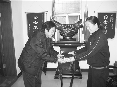 昨日上午,邓先生在武汉市江满公司接过失而复得的挎包及1.26万元现金时激动不已。(商为智)