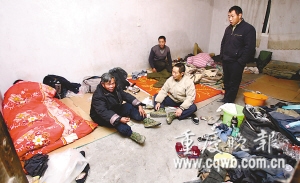 昨晚,黔江区城西街道大庄一组,10多名来自四川广安的民工坐在一起吃晚饭。饭是白饭,菜只有两个:一包黑色的咸菜、一包房东免费赠送的酸萝卜干。“因为没有拿到工钱,这样的晚饭我们已经吃了10多天。”
