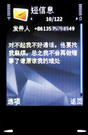 “今天,我又打她电话,她接起,不说话。我就对她说,我都50多岁的人了,你为什么要这样对我?她还是挂了电话,后来,发短信给我:对不起,我不好通话。他要找我麻烦。总之,我不会再做错事了,请原谅我的难处。