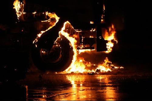 燃烧的大挂车停在江南大道上,30来米长。车上是一堆灰烬,灰烬顶端,有黑烟冒出来,发出呛喉的气味。大挂车烧得只剩下躯壳,轮胎没了,只剩轮毂;车窗没了,车头四周黑乎乎一片。