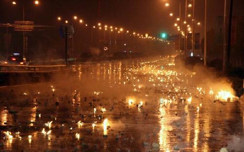 往远处看,江南大道上还有一堆堆电石在燃烧,伴随着雨水愈烧愈旺,像一条长长的火龙。