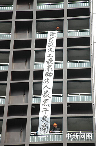 中新网贵港12月16日电 (记者 王刚)16日早,广西贵港市数十农民工爬上该市市区最高楼盘“联邦国际”欲跳楼讨薪,情绪激动的民工还挂出“最苦农民工、最累购房人、最黑开发商”、“还我血汗钱”等横幅声讨开发商。