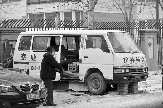 12月18日,大东区甘泉路4号,一台林业防火专用车停靠在路边,四轮被水泥砖垫起。与其他车辆不同的是,这台车侧面“长”出一根烟囱,车内堆放着劈柴,看来,这台车已经被改装成“房车”。(孙海)