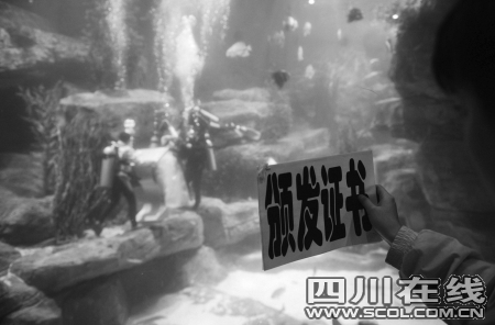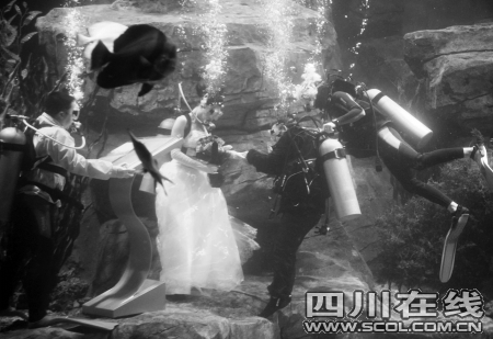 头顶,是冒着泡泡的海水;身边,环绕着缤纷的热带鱼,当你置身在这样的水下世界,心中会升起何种感慨?新人邓勇和郭小林给出的回答是“海枯石烂,一生一世。”昨日上午,作为成都首次“海底婚礼”的主角,他们在水下8米完成了结婚仪式,水底承诺、戴戒指、深情拥吻一样不落。