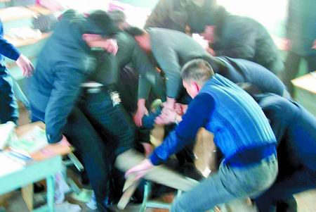 最先冲进教室的治安大队长吕晓辉眼疾手快,抓起板凳撞向袁某,把袁某撞得打了一个趔趄。在袁某站稳后高举起砍刀时,吕晓辉的双手已死死地扣紧了袁某高举起砍刀的手臂;随即迎着砍刀冲上来的副大队长董福振,与吕晓辉一起从身强力壮的袁某手中强行夺刀。夺下砍刀,吕晓辉和董福振的手已被利刃划得鲜血淋漓。袁某被冲进教室的民警制服和牢牢控制后,65名小学生无一人受伤,平安走出了教室。