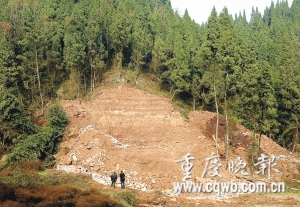 昨日记者在现场看到,山坡被挖成了近乎垂直的山崖,挖下来的新土堆成了一平坝,平坝下边还可看到石头砌成的堡坎。堡坎已被拆除了些,现场凌乱不堪。