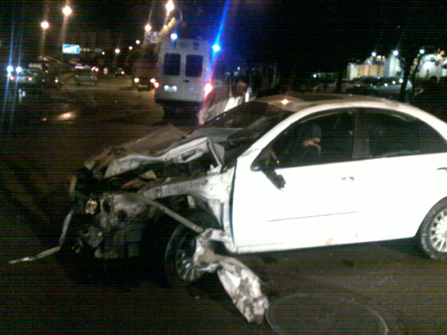 记者在现场看到,二层桥面快到坡底的隔离栏已经完全撞破,开出一个大约25米的缺口,而白色轿车则停在离隔离栏缺口约50米远的地方,车头等部位受损严重几乎接近报废。轿车驾驶员瘫坐在人行道边,有轻微的受伤,身披一件警用大衣,但不见肩章和警号,身上散发着浓烈的酒气,对于民警的询问几乎无法正常作答。