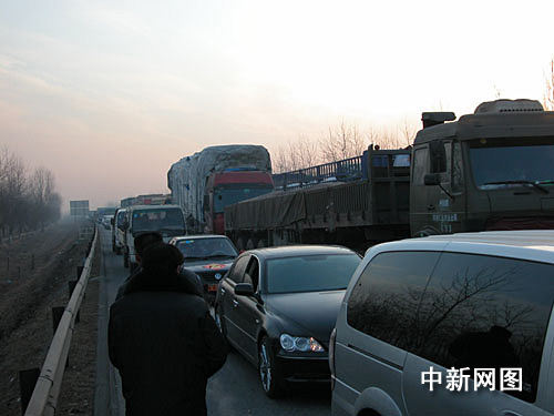 经高速交警现场疏导清理,被堵塞的高速车道才得以通行。记者粗略统计,该事故致近千辆车被堵达一小时,堵塞路段达五公里。