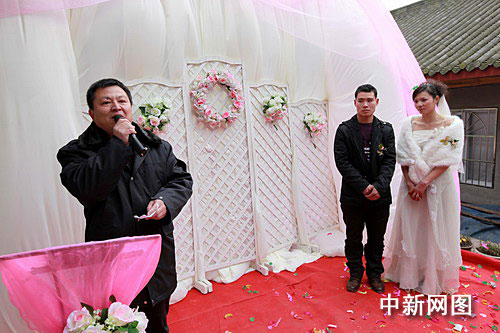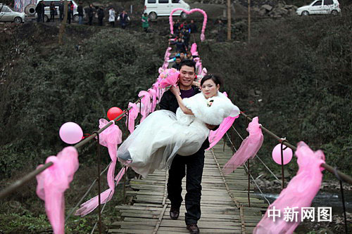 上午10点,按照地方习俗,在鞭炮声和彩花飘落的范围下,新郎李建超抱着新娘张燕走下婚车,踏过进入门前的索桥,在亲朋的欢声笑语中,走进装饰一新的新房。中午12点30分,在亲朋好友的期盼下,在媒体镜头的关注下,在司仪的主持下,两位新人步入神圣的婚姻殿堂。