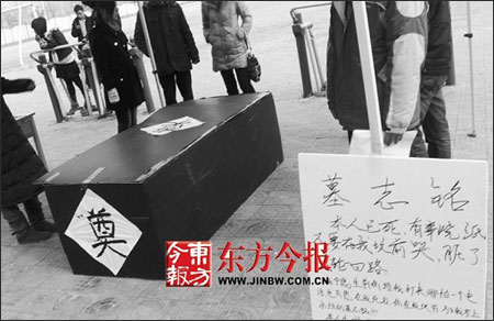 按照规则,他要先立好遗嘱,身上裹上白布,耳朵塞着连接MP3的耳机,听着哀乐静静地在棺材里躺10分钟。时间到,同学们打开棺材盖,庞军龙迫不及待地从棺材里爬出来,大声说:“我不能死,想着生前那么多事让我干得乱七八糟,死后交给别人干,我更不放心,还是我自己来,心里比较踏实。”