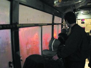 昨日下午,记者亲身体验乘坐多路公交车后发现,车上除了司机正前方的风挡玻璃没有上霜外,四周车窗全被厚厚的冰霜包围,多辆公交车一直也没有听到报站的声音。