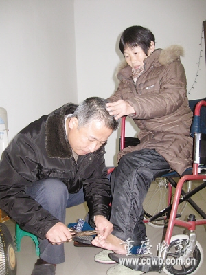 “他一个人顶四个人。”现在,45岁的陈昌良满头白发,张兴平心疼地说,这都是苦熬出来的:在家里,陈昌良既是一名丈夫,又是孩子的母亲和父亲,还是她的保姆;在外,他又是大足县宝顶司法所一名司法干警。每天清晨6点,陈昌良就要起床打理家务,伺候妻子;忙完一天的工作,晚上回家还要做饭、洗衣服,不足2000元的月工资,既要供上大学的儿子,还要为妻子买药。