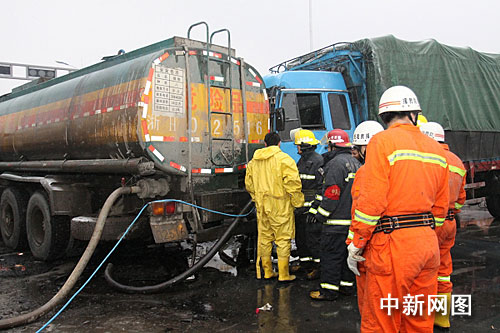 凌晨5时15分,槽罐车也赶到事故现场,在消防水枪的掩护下,开始对事故车辆内的剩余硫酸进行导罐。